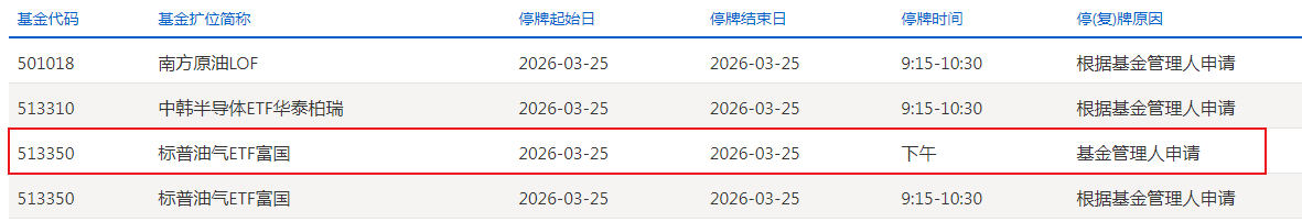上证报中国证券网讯据深交所公告,标普油气ETF富国3月25日下午临时停牌。Choice数据显示,截至3月25日11点30分,尽管WTI原油期货价格下跌约4%,标普油气ETF富国早盘依然小幅上涨0.86%,截至午间收盘溢价率为26.24%。